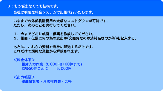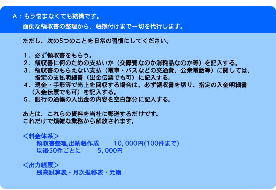 給与計算・記帳代行・経営診断・資金繰り診断・書類スキャニング・生損保代理店 | ||